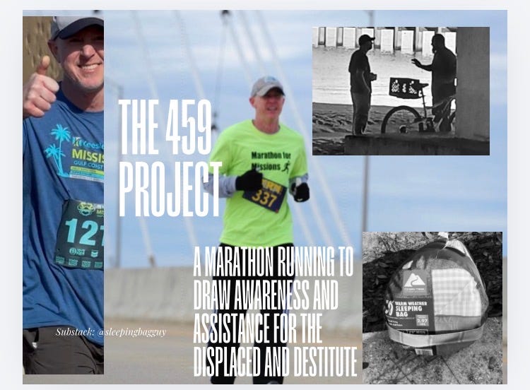 -Share: Relate our cause to your churches, club organizations, or social media accounts. You can follow our progress with journal entries posted on Substack at https://substack.com/@sleepingbagguy and updates through the GoFundMe.